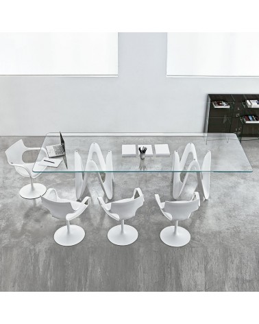 Mesa rectangular con sobre cristal y base de madera o cristalplant. Diseño de Gianluigi Landoni.
